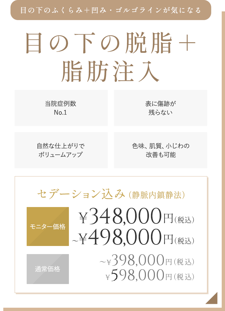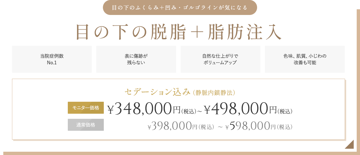 採取した脂肪をこだわり抜いて加工し注入することで定着率を高め、他院では難しい色グマの改善にも優れた効果を発揮し、目に見える変化を実現します。
